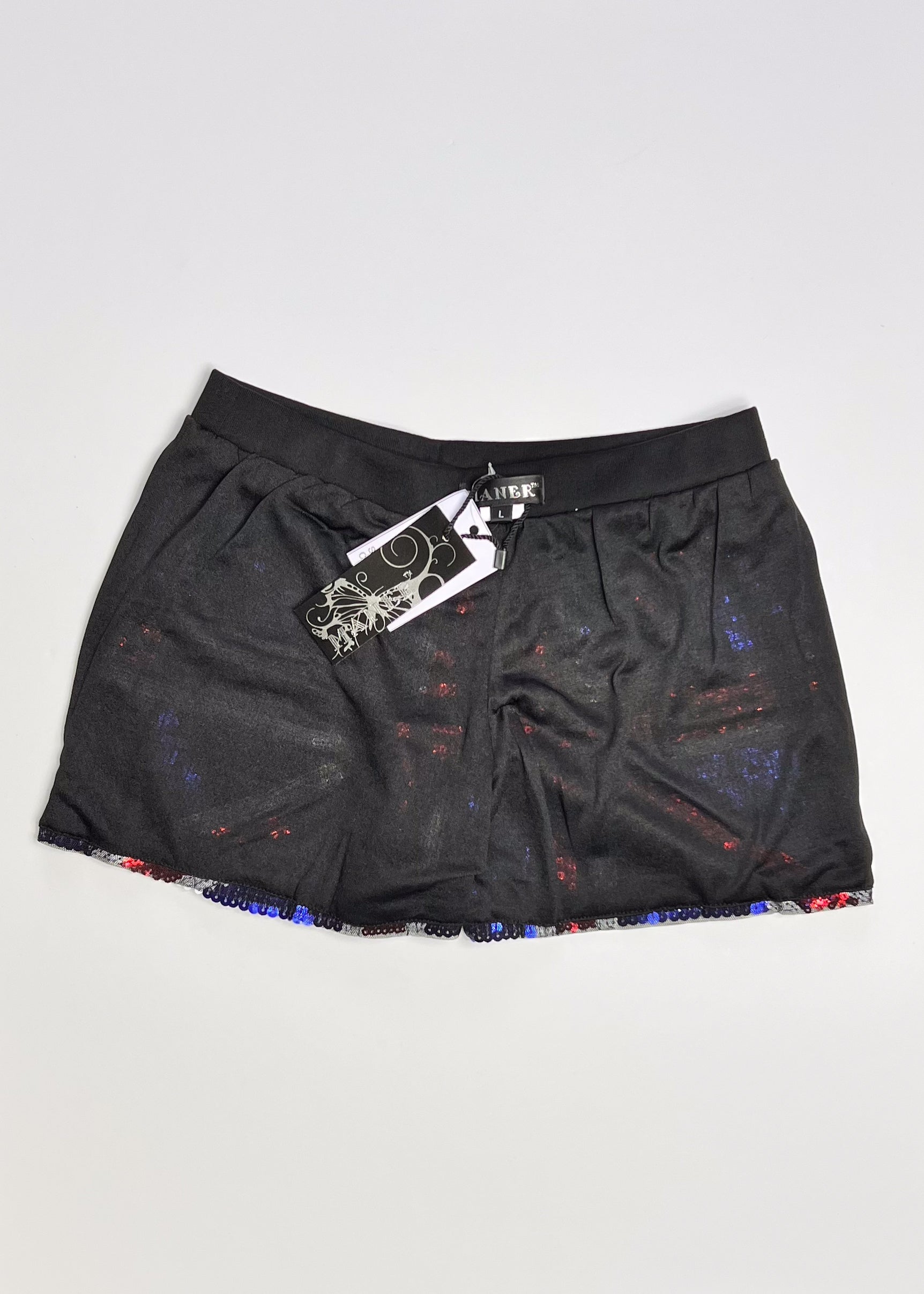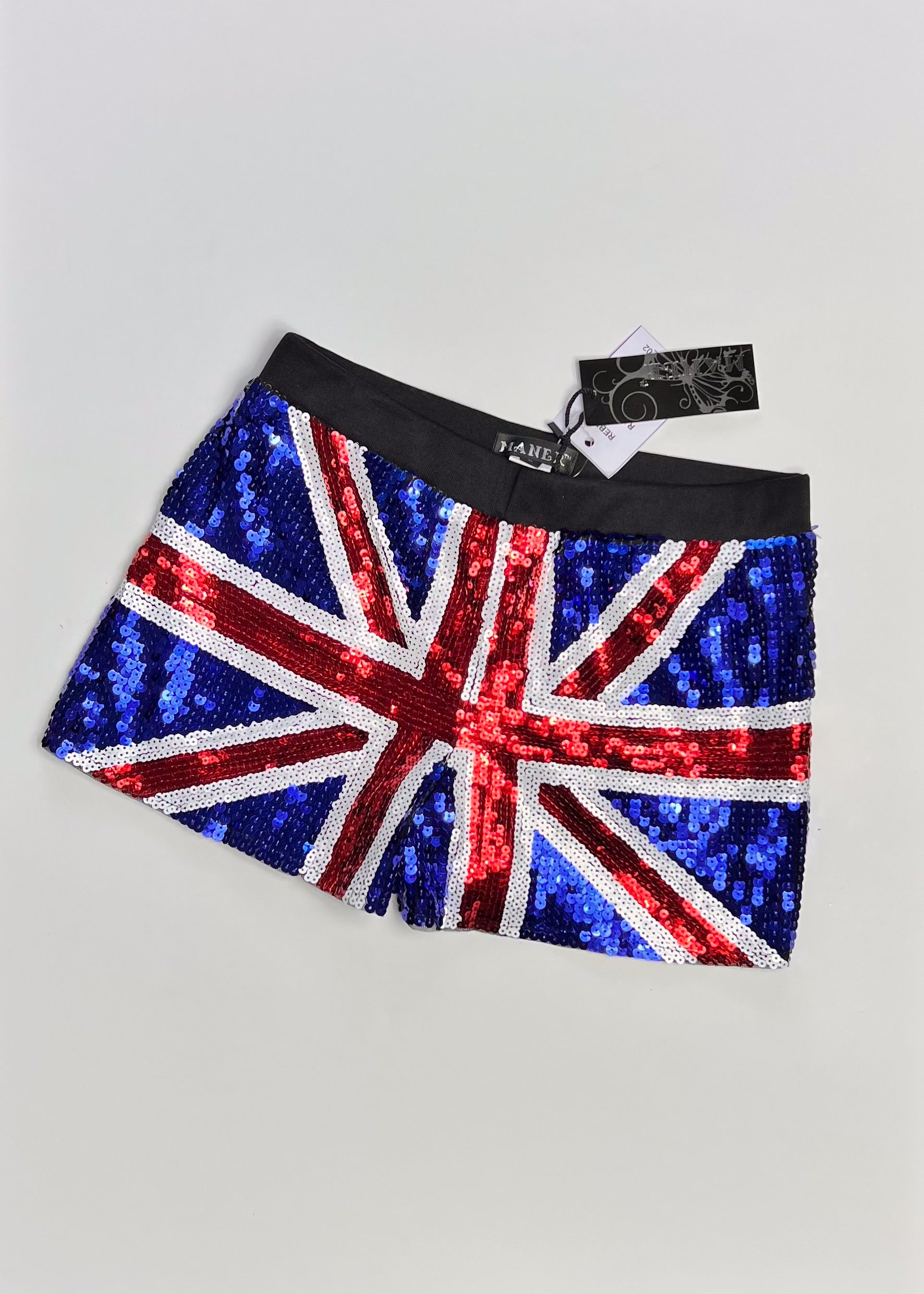 Large, sequin Union Jack booty shorts! Channel your inner Geri Halliwell for fancy dress, Eurovision or the World Cup in these incredible all-over sequin shorts with an elasticated black waistband. Fully lined. Booty short fit with a mid-rise front.